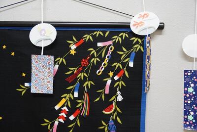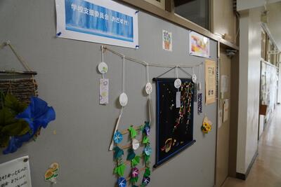 7月に入り、職員室前の廊下には、学校支援委員会(名称は『おぎすけ』)による七夕飾りが掲示されました。