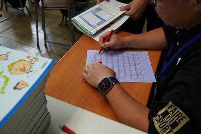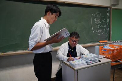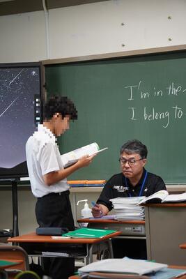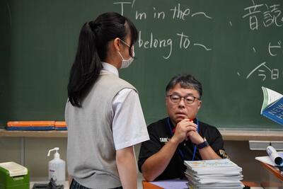 7月11日(金)、休み時間を使って3年生が音読テストを行っていました。Teamsで録音したものも評価材料としていますが、実際にその場で音読をしてもらい、教員がSからCまでの評価をつけます。生徒はあまり緊張した様子もなく、頑張って取り組んでいました。