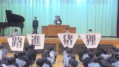 3年では、修学旅行、学芸発表会について、協力して達成感を得られたということや、受験に向けてみんなで頑張ろうといったお話がありました。また、今年の漢字として、各クラスが考えたものを発表しました。最後に、学年として未来に向かって「路」をつくっていくというお話がありました。
